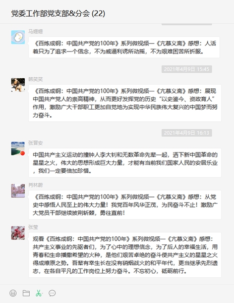 公司所屬各級(jí)黨組織堅(jiān)持每日在支部工作群中推送《百煉成鋼:中國(guó)共產(chǎn)黨的100年》系列微視頻,通過8分鐘學(xué)習(xí)百年黨史,讓黨員干部更加理解中國(guó)共產(chǎn)黨為什么能、馬列主義為什么行,中國(guó)特色社會(huì)主義為什么好。利用“微分享”小窗口、大視角的形式開展黨史學(xué)習(xí)教育,打造指尖上的思想“加油站”。目前,公司所屬各級(jí)黨組織已推送《百煉成鋼:中國(guó)共產(chǎn)黨的100年》系列微視頻12期,每期都引發(fā)了黨員干部的熱評(píng)熱議。